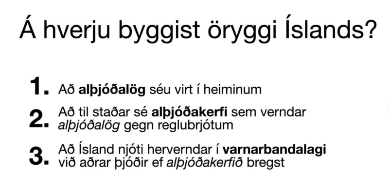Fyrsta stoðin eru alþjóðalög, þar sem Sáttmálinn um hinar sameinuðu þjóðir er mikilvægastur. En þar sem alþjóðalög munu alltaf verið þeim annmarka háð að erfitt er fyrir ríki að framfylgja þeim hvert um sig þá myndar kerfi alþjóðlegra stofnana aðra stoð öryggis. Í alþjóðastofnunum er vettvangur til þess að leysa úr ágreiningi ríkja og finna leiðir til þess að takast á við sameiginleg viðfangsefni. Við stofnun Sameinuðu þjóðanna var hugmyndin að beiting vonpnavalds í heiminum yrði einungis heimil í bráðri sjálfsvörn eða á grundvelli ákvörðunar öryggisráðsins. Þótt segja megi að það hafi gengið „svona og svona“ þá er það engu að síður staðreynd að á tímanum sem liðinn er frá lokum síðari heimsstyrjaldar hefur sáralítið verið um landvinningastríð í heiminum í samanburði við fyrri aldir. Þriðja stoð öryggis Íslands, ef bæði alþjóðalög og alþjóðastofnanir reynast haldslaus, eru svo þau varnarbandalög og fjölþjóðastofnanir sem við höfum ákveðið að tilheyra.